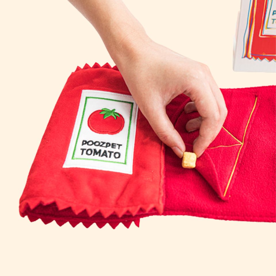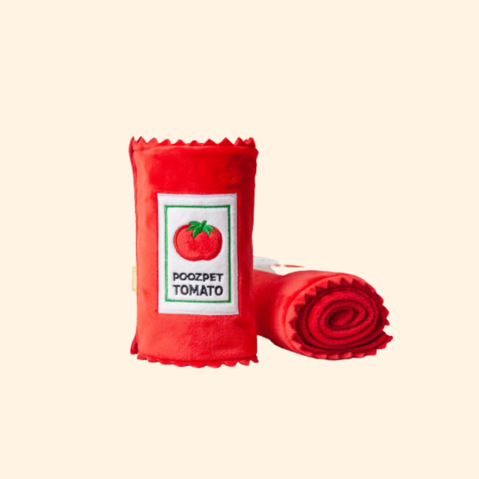 Treat your pups with our Juicy Canned Tomato Soup! Includes a crinkly can where you can also turn it into a snuffle mat! There are multiple food pockets for you to hide your pups' favourite treats inside! You can also roll up the long cloth to enhance the challenge! Perfect for a hide-and-seek play!