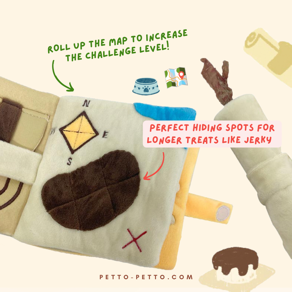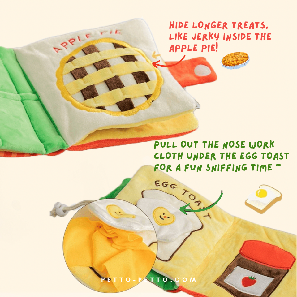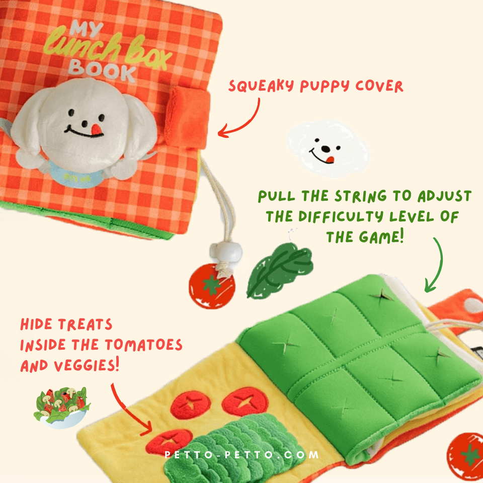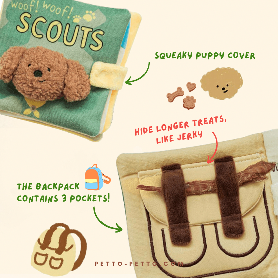 Our Good Pups Storybook- The Lunchbox Story and Woof Woof Scout Storybook are guaranteed to bring your pups a fun, challenging and interactive reading time! The story book can be played in a variety of ways, where each page of the book contains a unique nose work game for your pup. You can hide your pup's favorite treats inside the book for a fun sniffing time! The book is also fitted with crinkly paper and squeaker which can keep your pups entertained for hours!