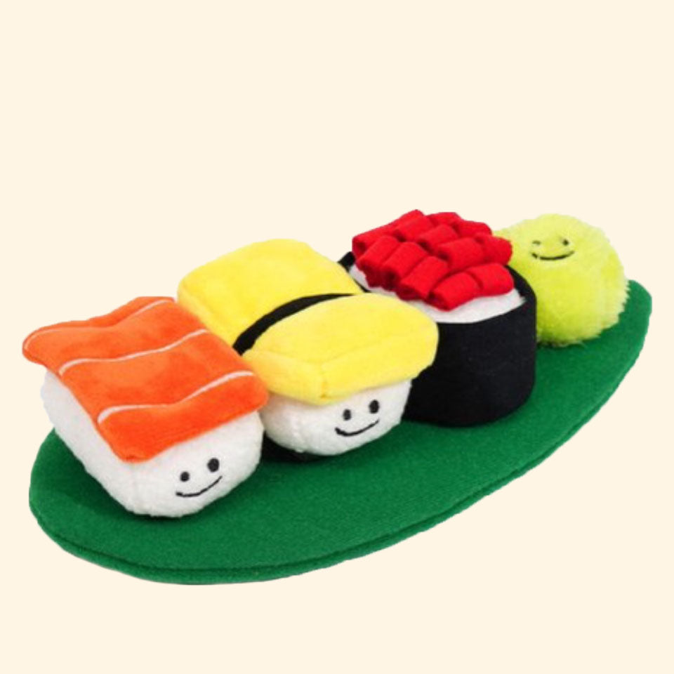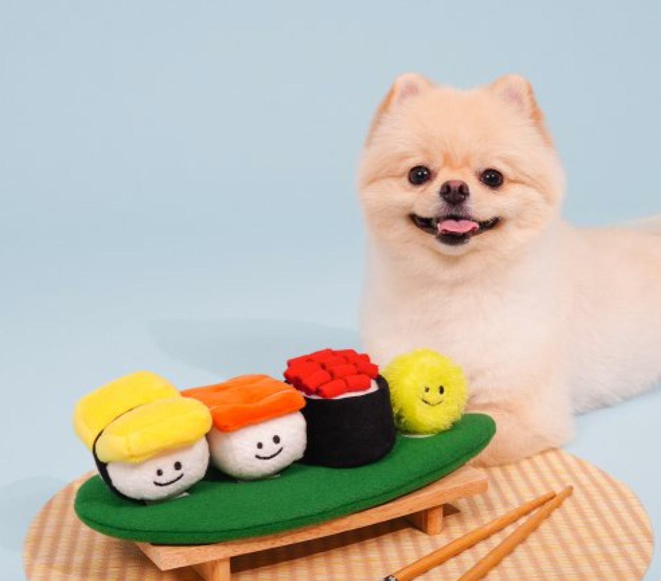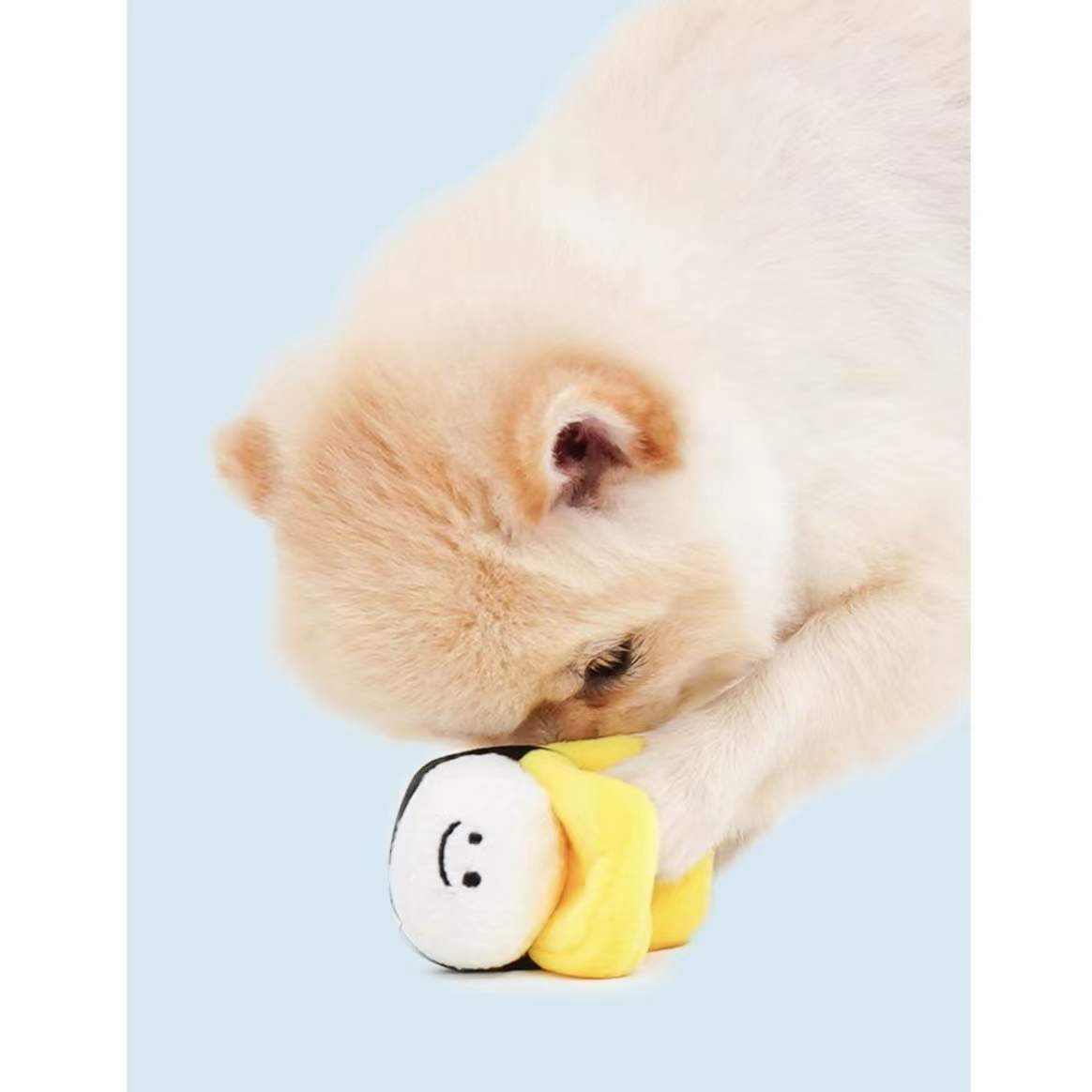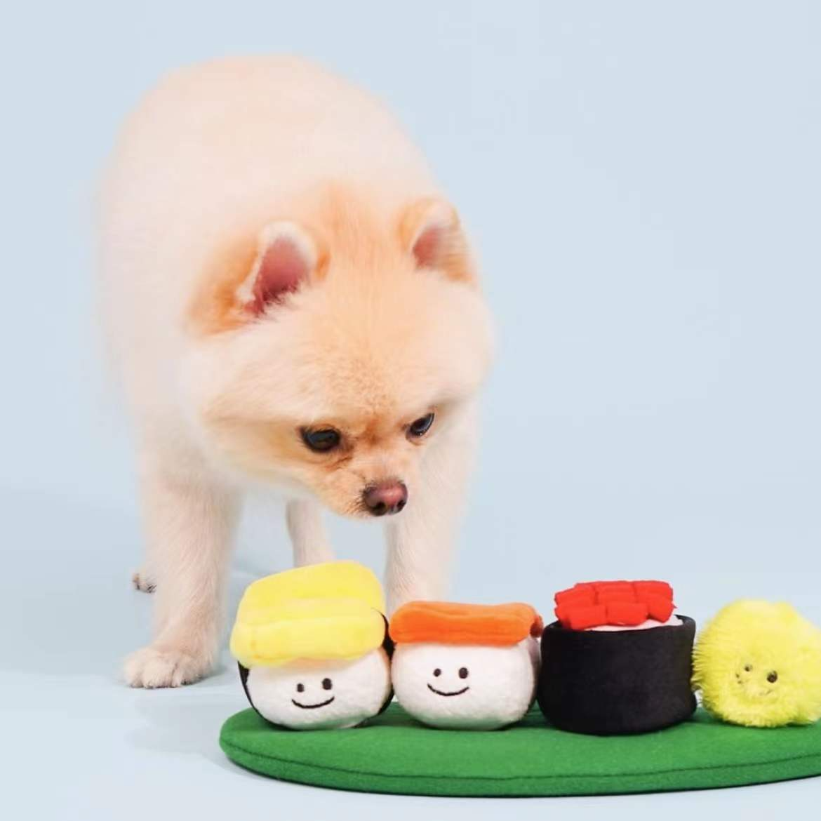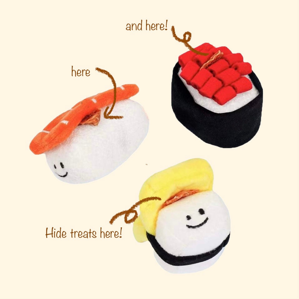 It's sushi time! Taste a plate of happiness with our Sushi Sampler Set which includes 3 pieces of sushi- Salmon, Tamago (sweet egg) and Ikura (salmon roe). It is a fun and interactive toy perfectly designed for your small and big furry friends! You can hide treats inside the sushi, and make you pups use his sniffer to find them! Have fun!