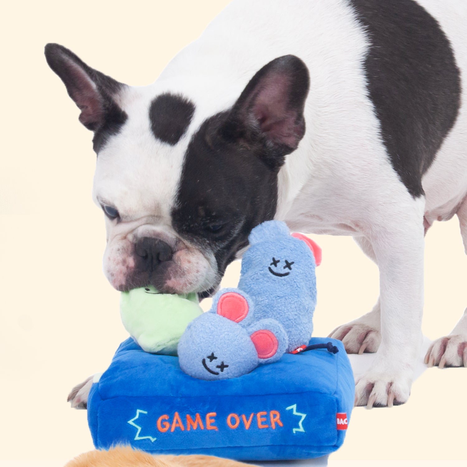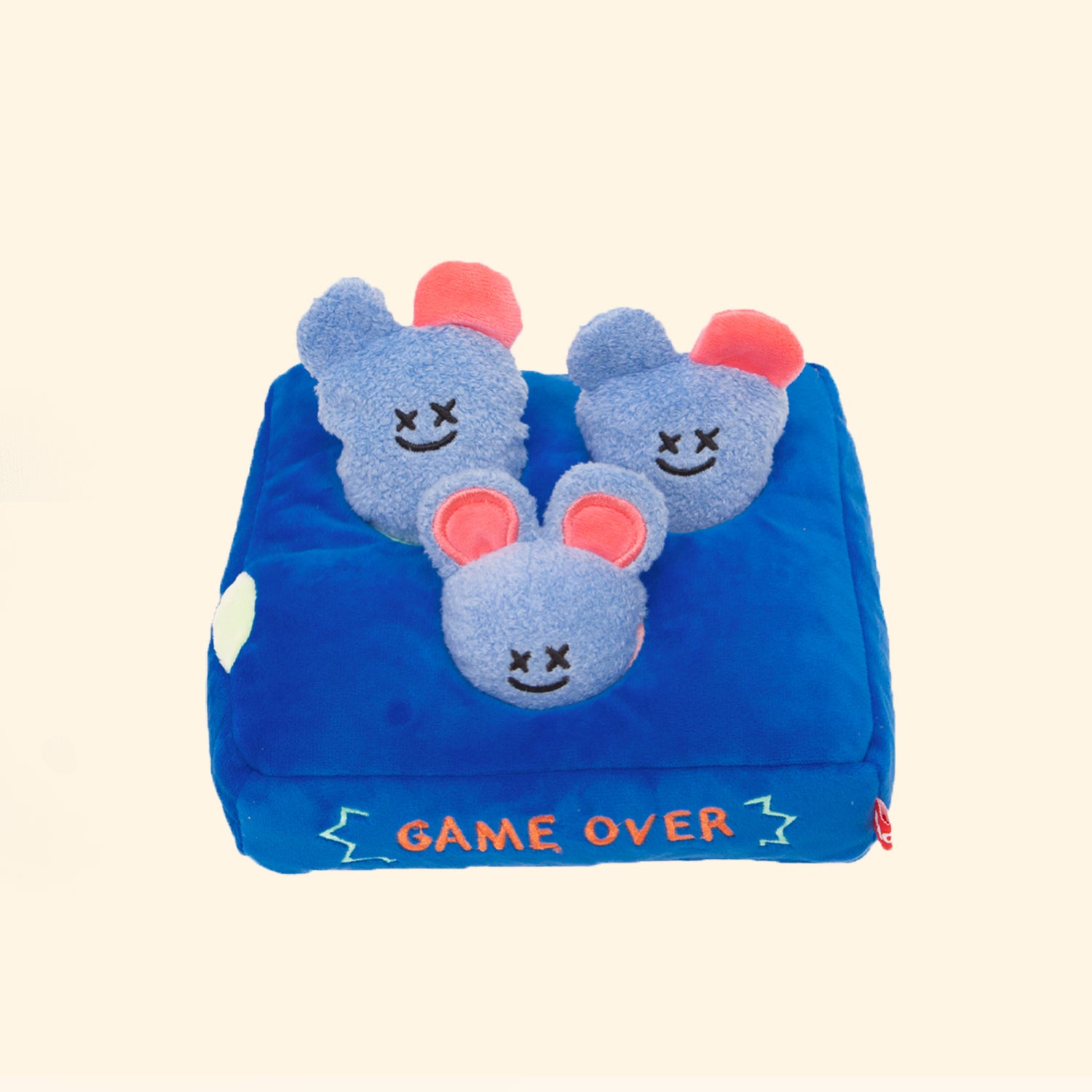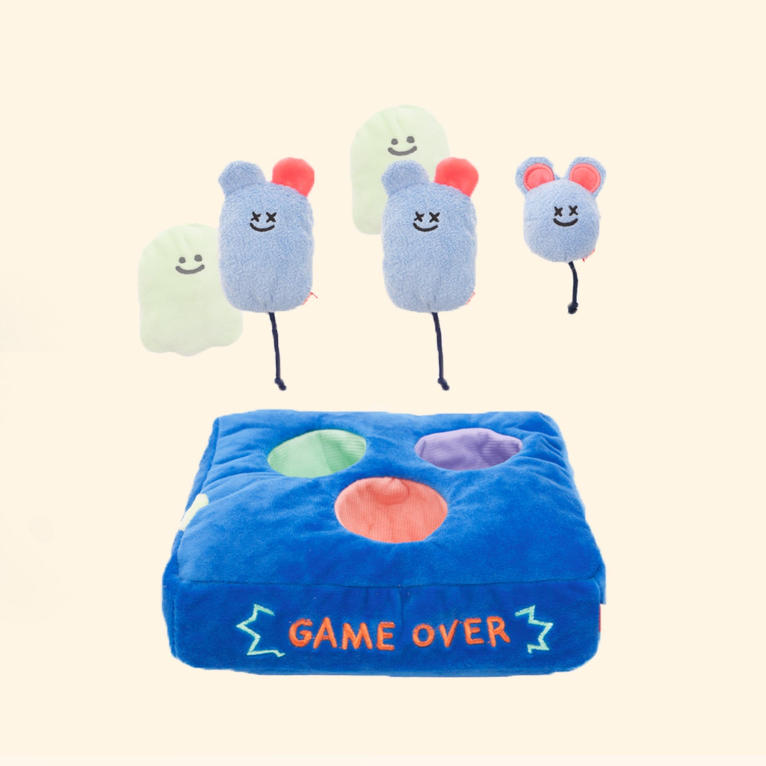 Our Little Ghost Mice Hunter House Toy comes with a crinkle game board and three little mice- one of the them can squeak and the other two are reversible and can be transformed between ghost and mouse form. You can also hide your pup's favorite treats inside the holes or inside the food pockets of the two ghost mice. Have fun!