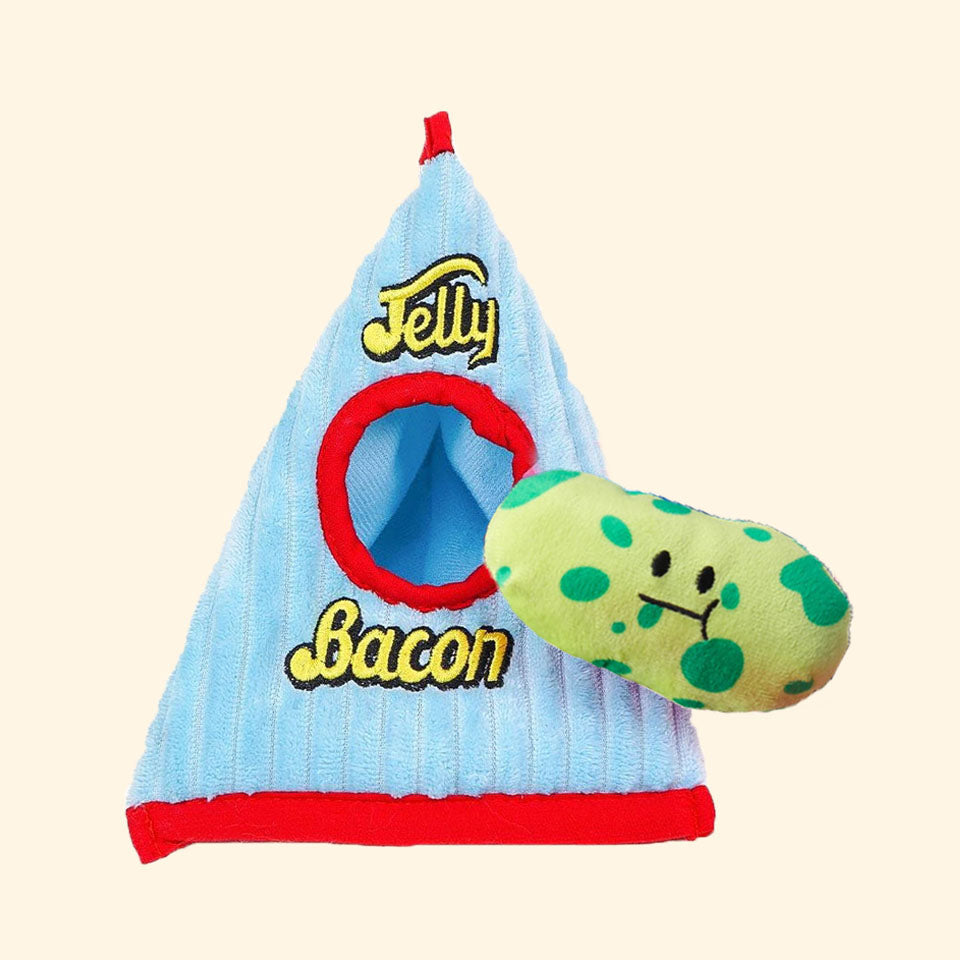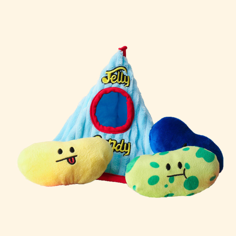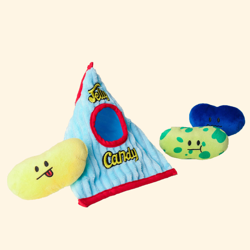 Time to hunt the candies! Let you pups dive right into our Jelly Bean Candy House and catch the candies! The Jelly House is made of paper with rustling sounds and the three jelly bean candies contain squeaky sounds which are great for playing throwing games with your pups!