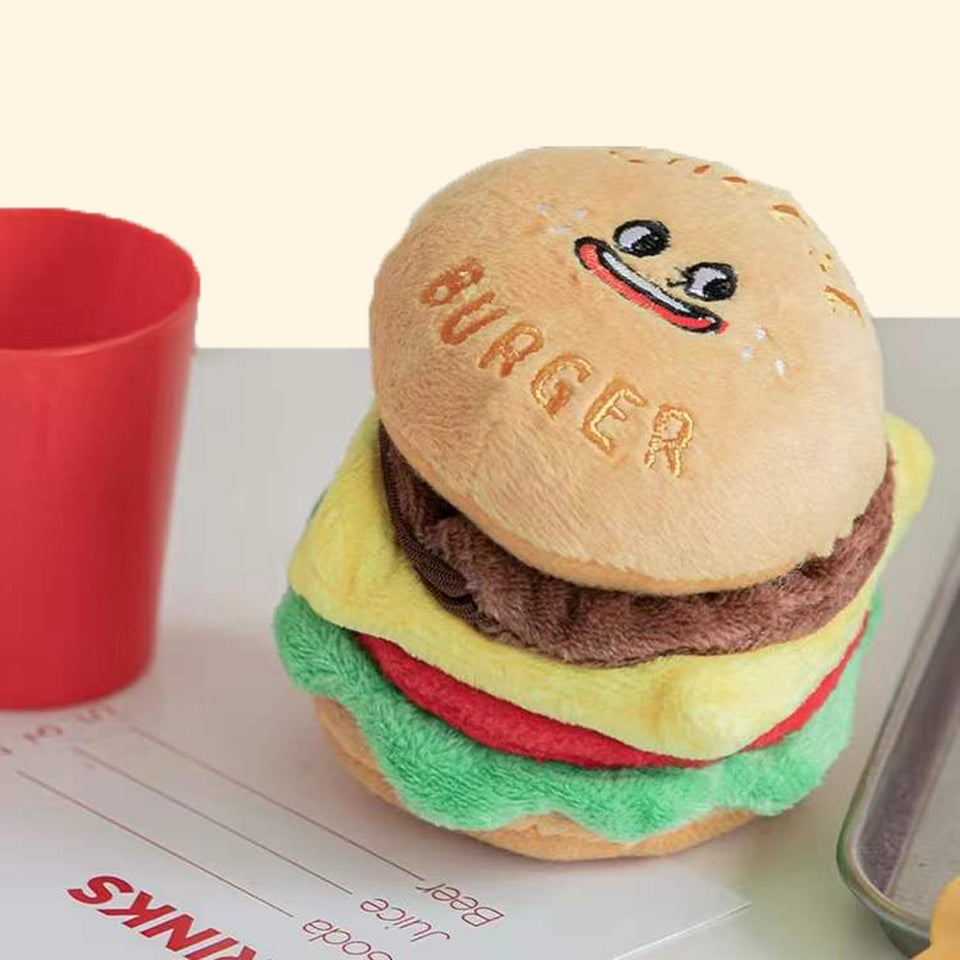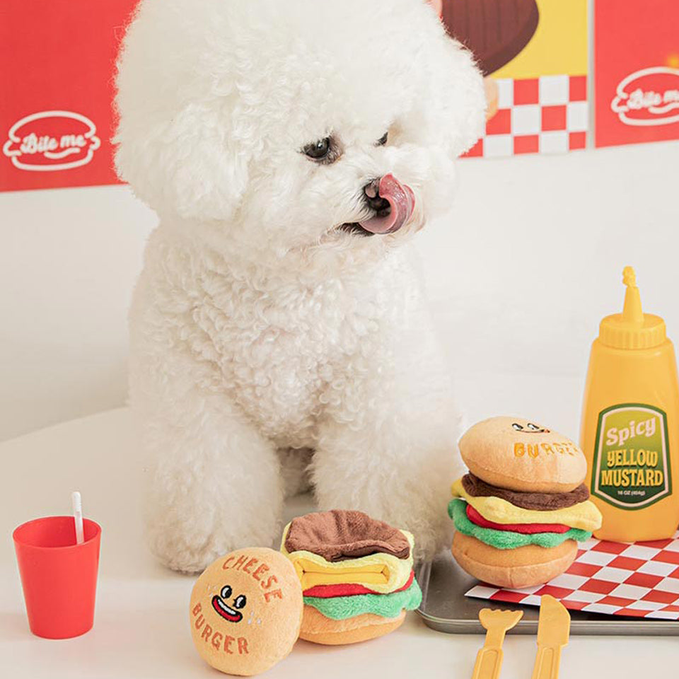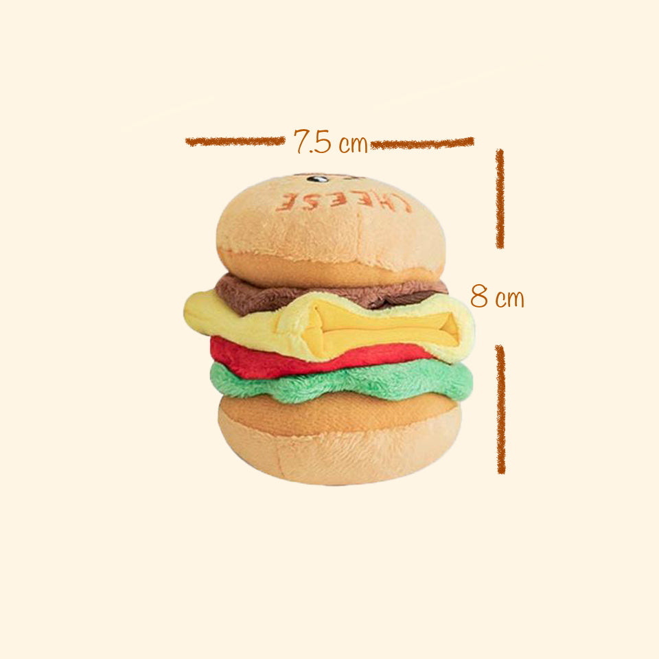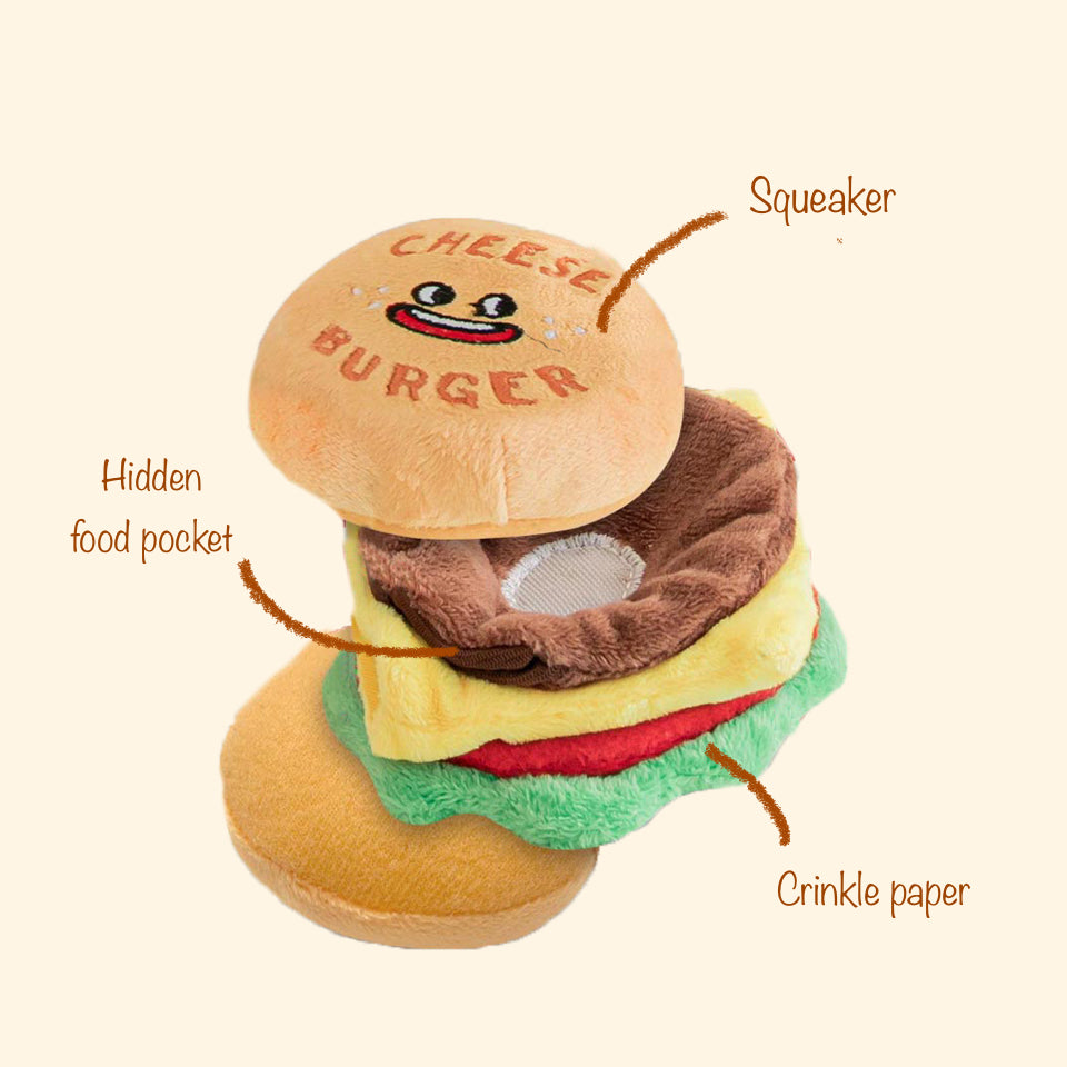 Hey frens, are you ready for some tasty chess burger? Our Petto Happy Cheese Burger comes with squeaky bread, crinkle veggies and delicious patty fitted with a hidden food pocket! To level up the game, hide extra treats in between the buns and veggie/ cheese/ burger layers and let your pups sniff through the juicy layers! The squeaky bread and crinkle veggies also make sounds that will keep your pups entertained for hours!