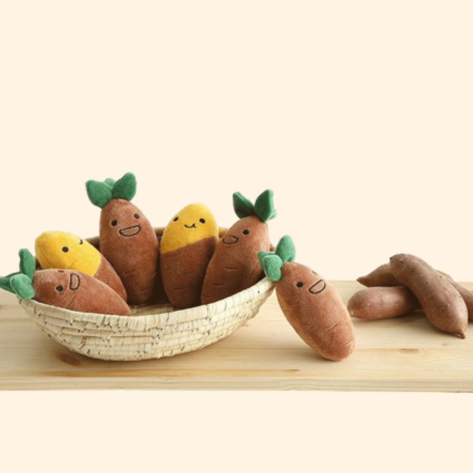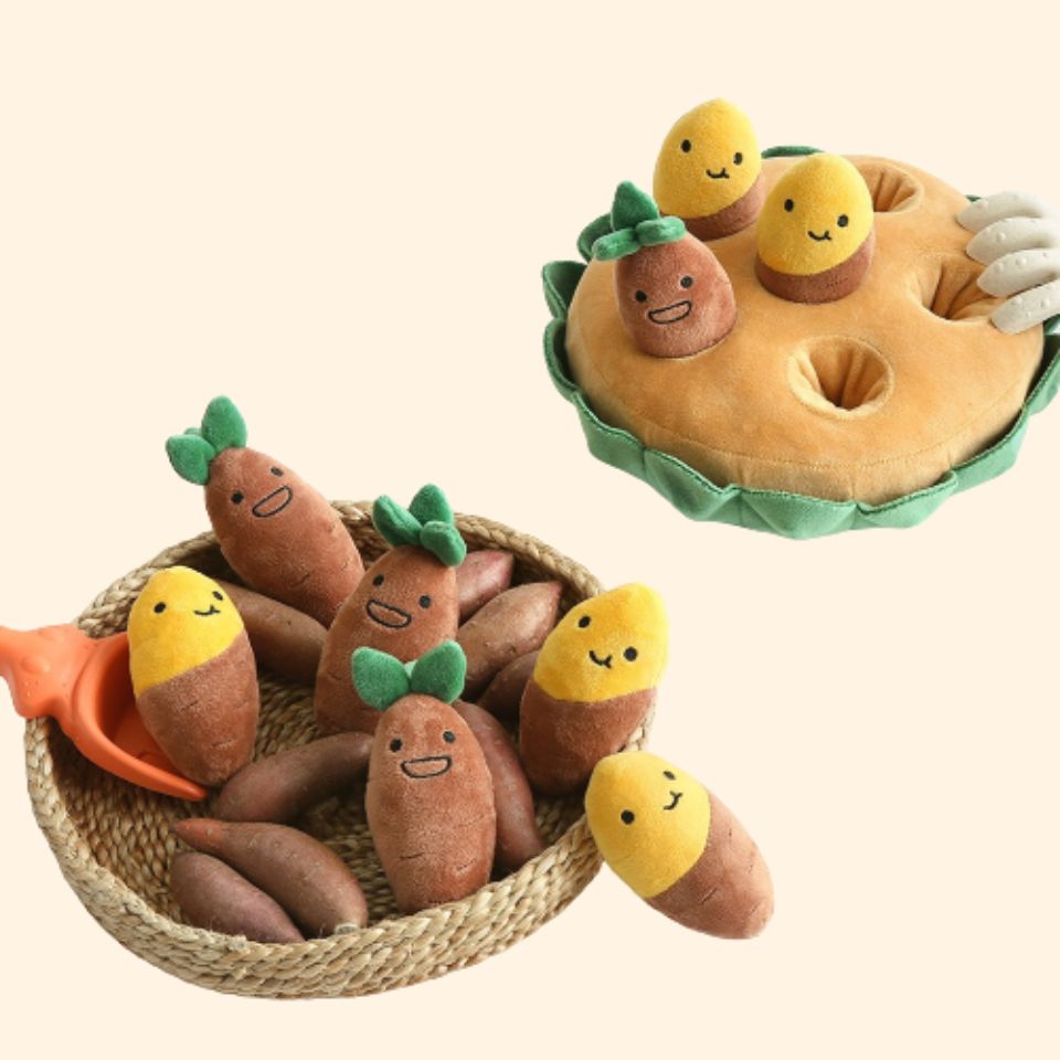 Explore our Sweet Potato Puzzle Nosework Toy where you can pull out the sweet potatoes and hide extra treats inside the holes and let your pups work for their food! A set comes with 6 sweet potatoes.