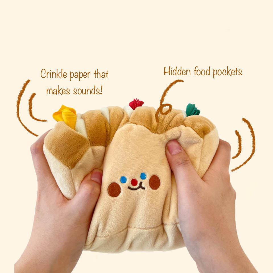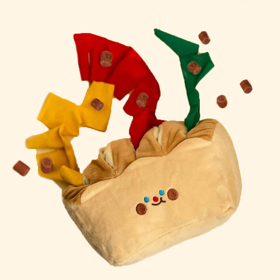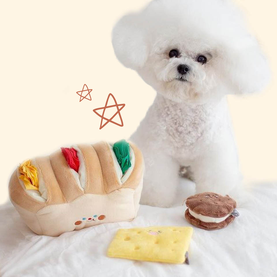 Our Petto Club Toast Bread is just as delicious as they look! Filled with loads of cheese, tomato and veggie, this yummy treat is guaranteed to be your pup's new favorite! You can hide treats between the food pockets or even roll up the treats with the long cloth to level up the game! The toast bread also includes crinkle paper that deliver sounds to keep your pups entertained!