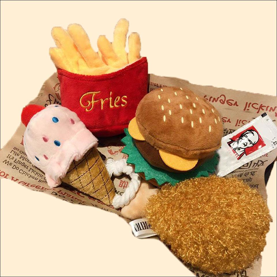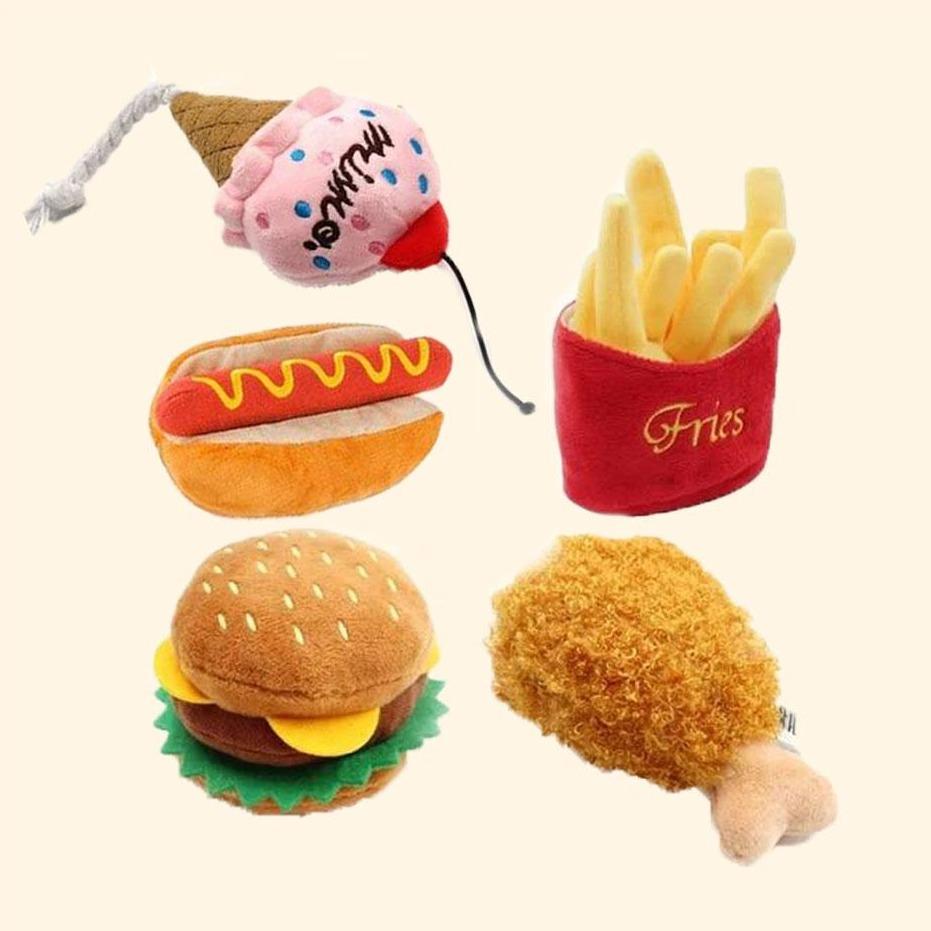 Our PETTO Happy Meal Set is a classic and guilt-free option for your fun-hungry ones. Set includes Frenchie Fries, Barky Burger, Fluffy fried chicken, Hot diggy dog and ice-cream. Each toy includes high-quality round squeakers that deliver sounds to keep your pups entertained!