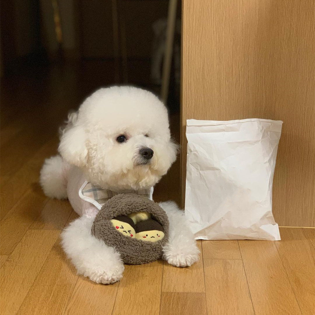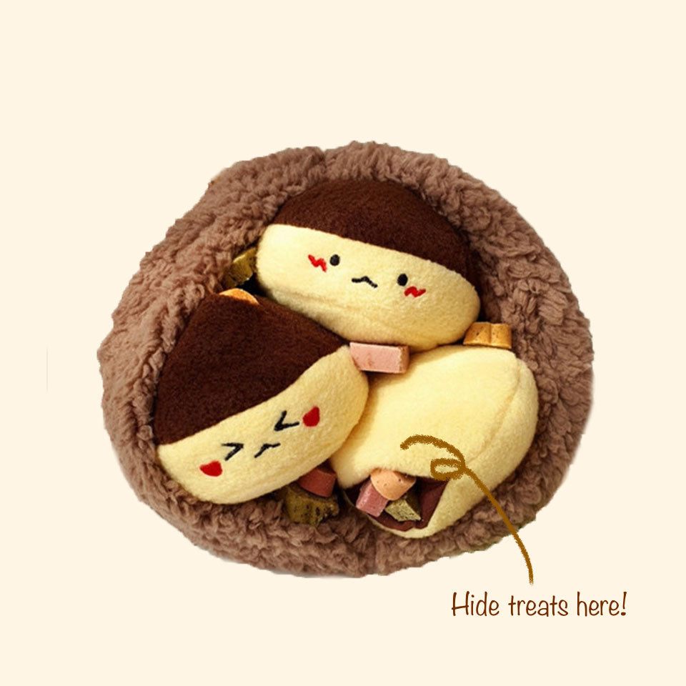 Train your pups to work for its food with our Little Chestnut Family Sniff Toy Set! You can hide treats inside the chestnut skin and cover it with the 3 small squeaky chestnuts for a challenging fun. This nosework toy can keep your pup entertained for hours!
