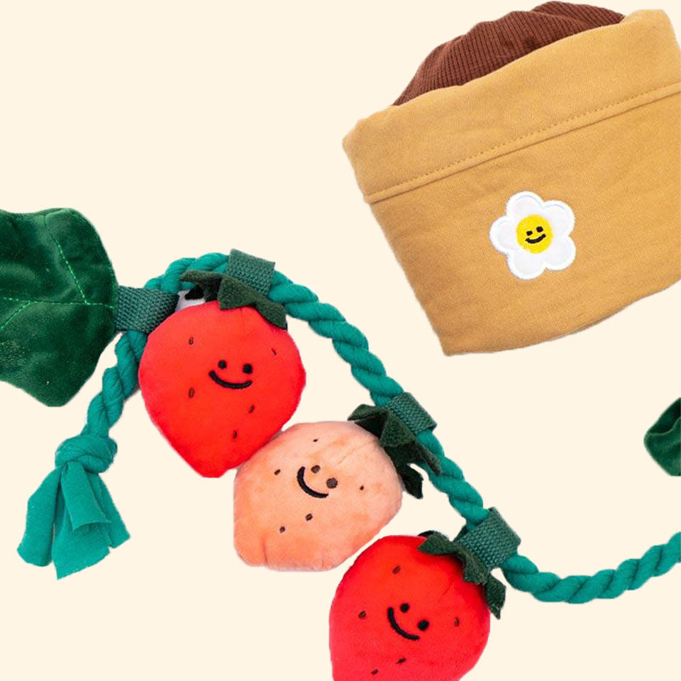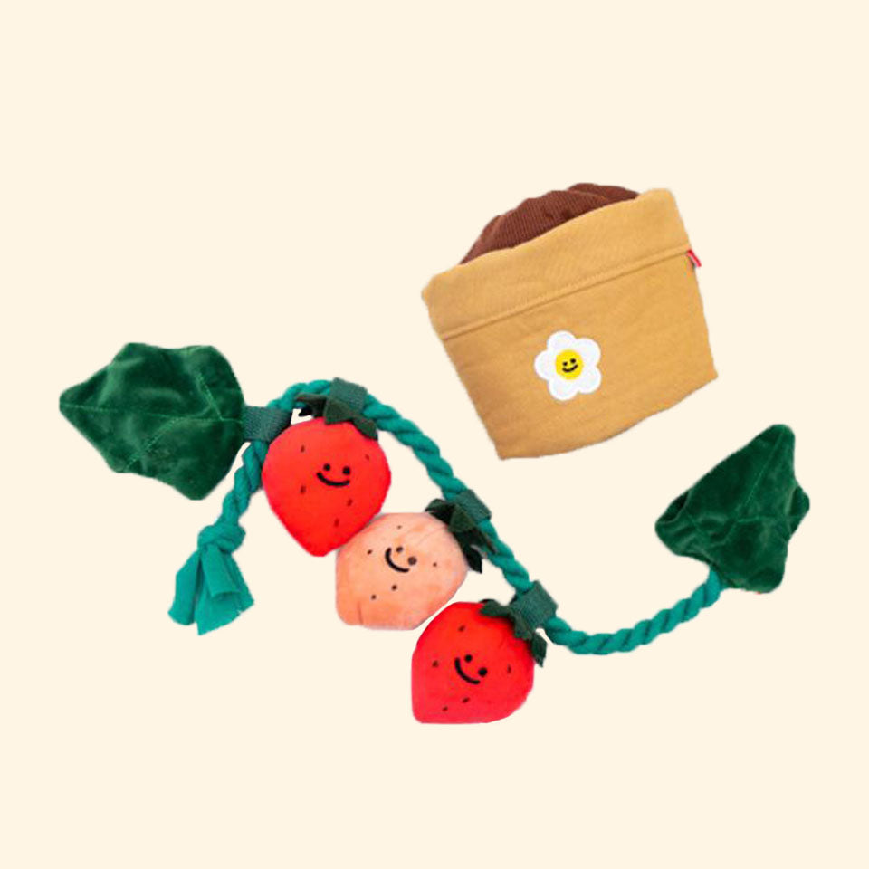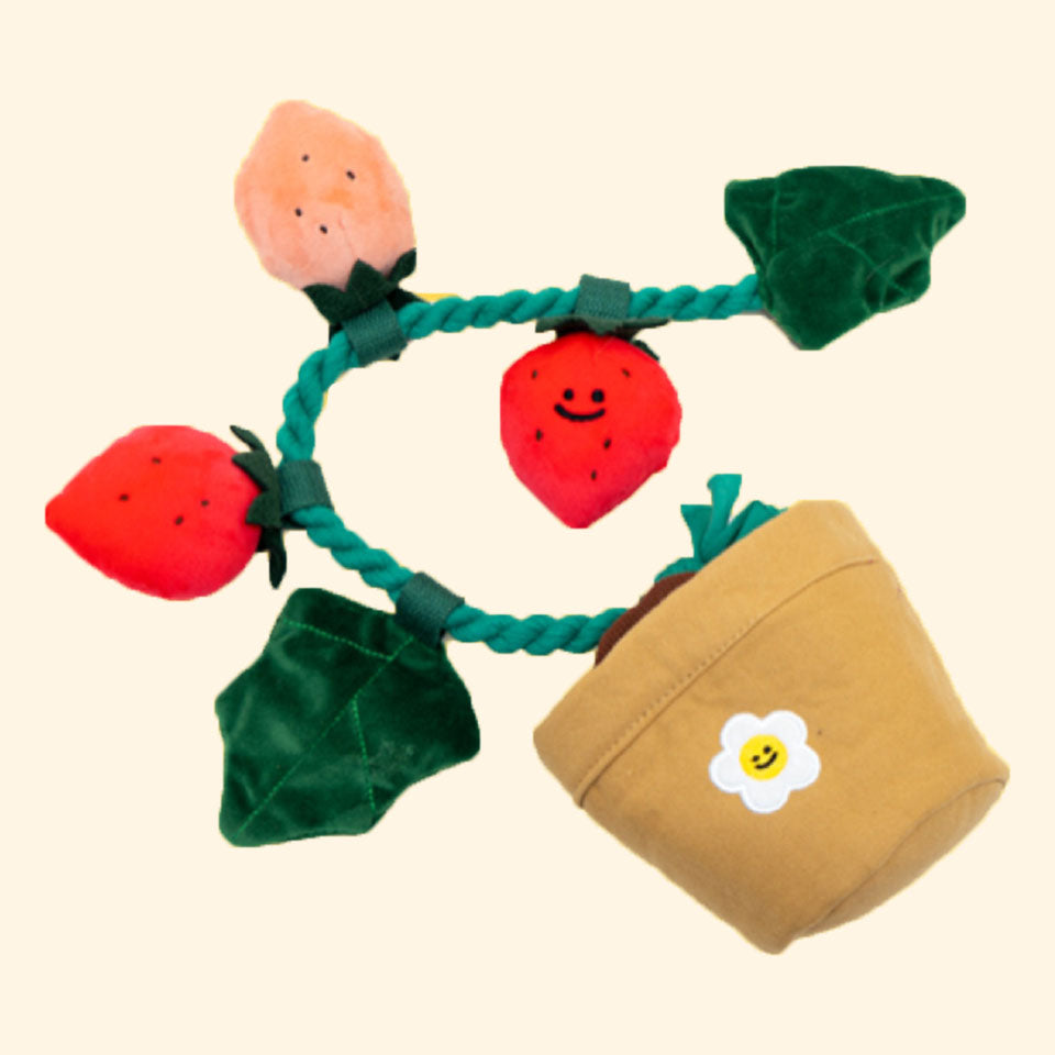 It's strawberry season! Are you ready for some harvesting? Our Strawberry Potted Plant Sniff Toy is an interactive nosework toy and has multiple ways to play with! Pull out the whole vine and have a game of tug or let your dog hunt for all the squeaky strawberries hidden inside the pot. You can also hide treats in the pot and let them sniff out the tasty rewards! Have fun!