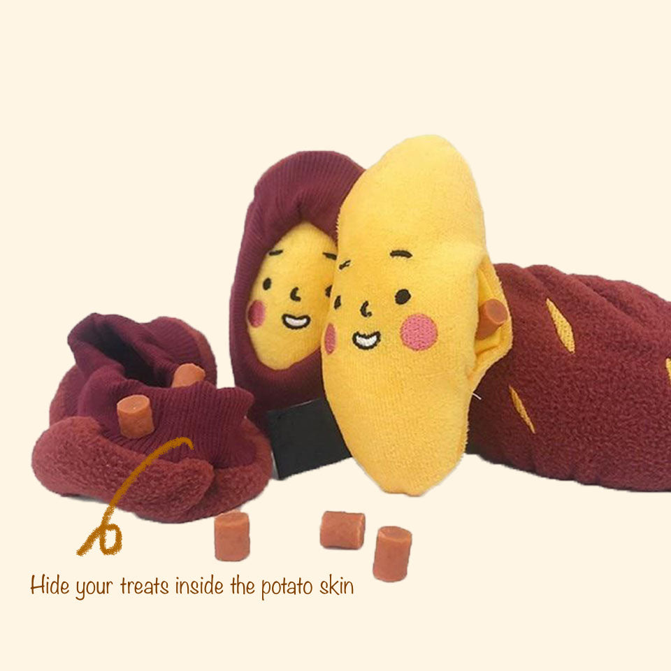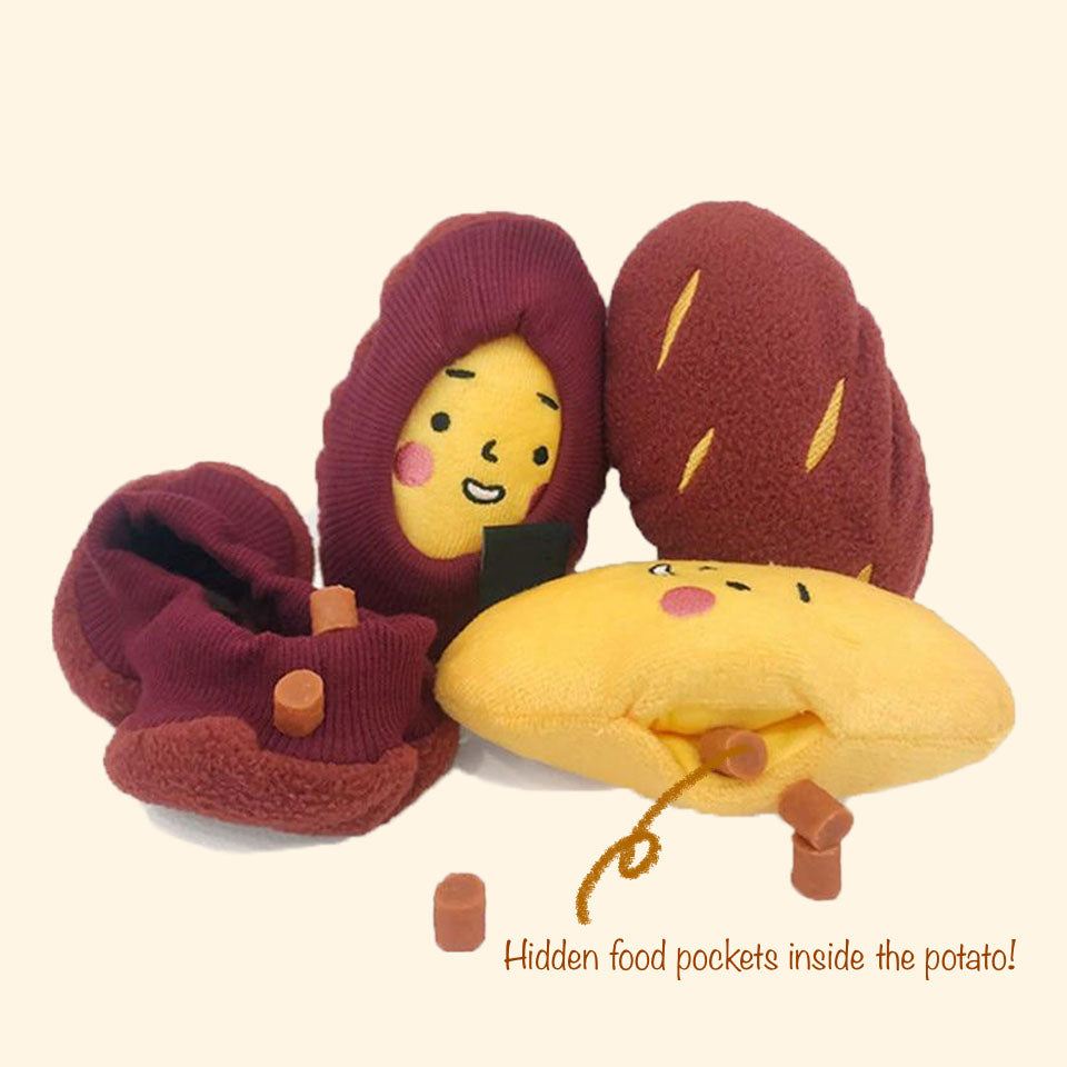 It's hide-and-seek o'clock! This Sweet Potato Plush Toy is a fun and interactive toy perfectly designed for your small furry friend! You can hide treats inside the hidden food pockets, and make you pups use his sniffer to find them! The potato skin can also be removed to create different ways of playing. Have fun!