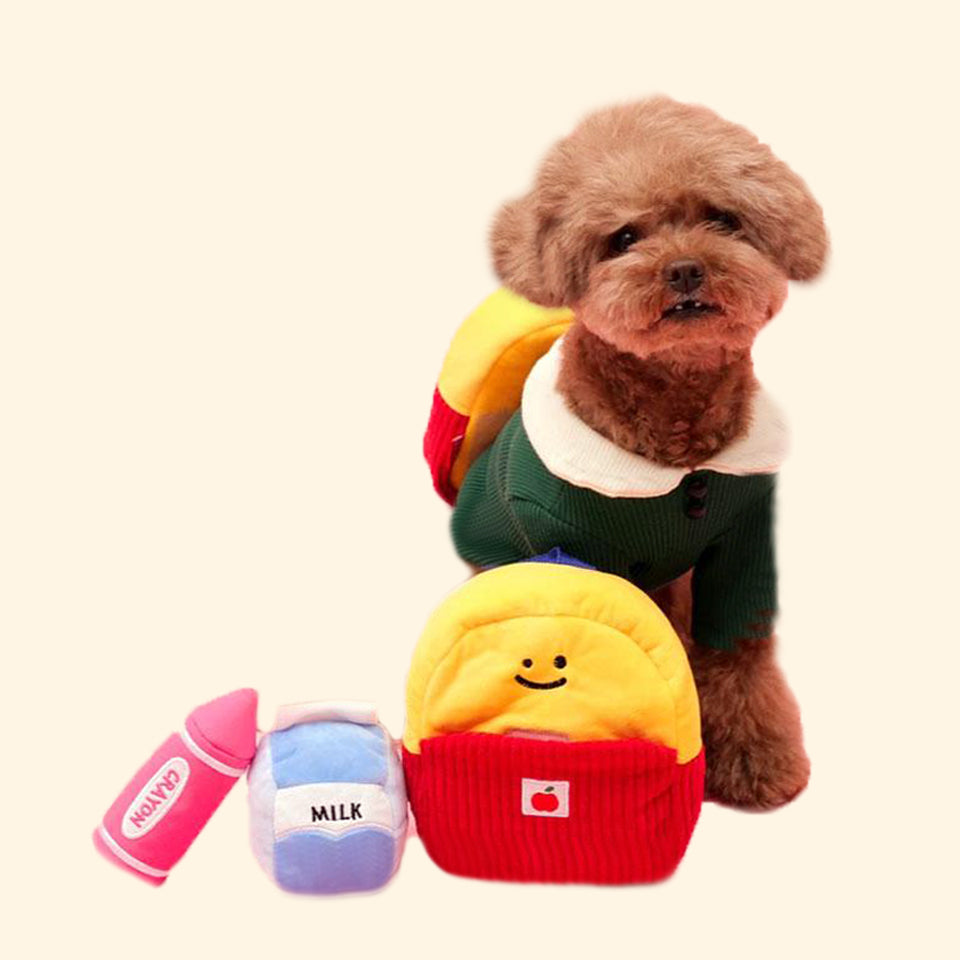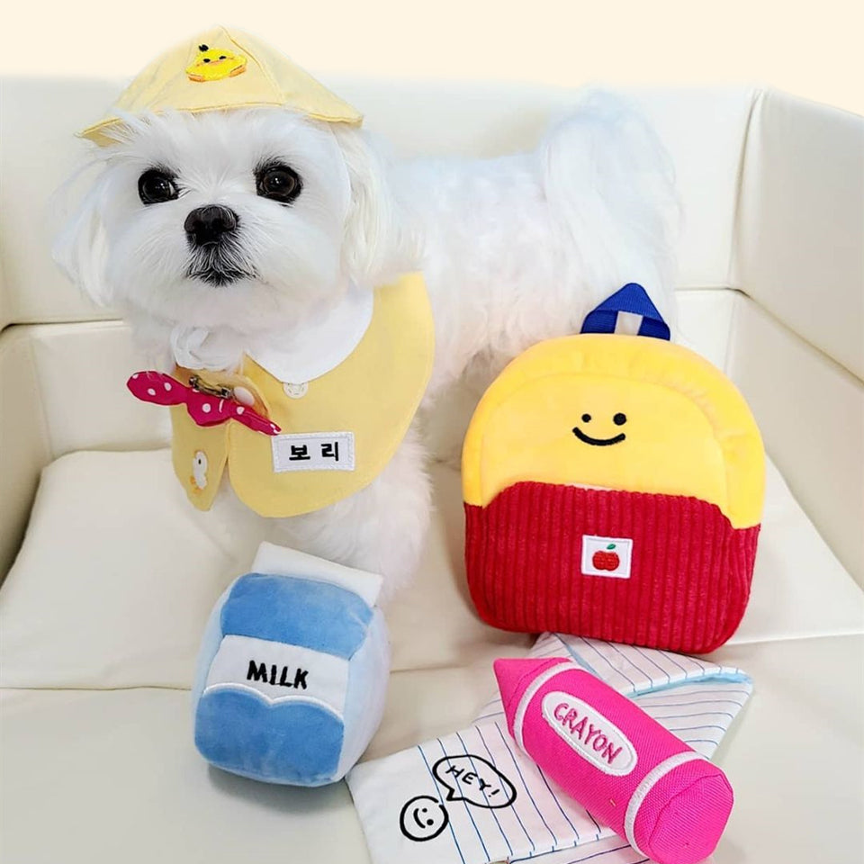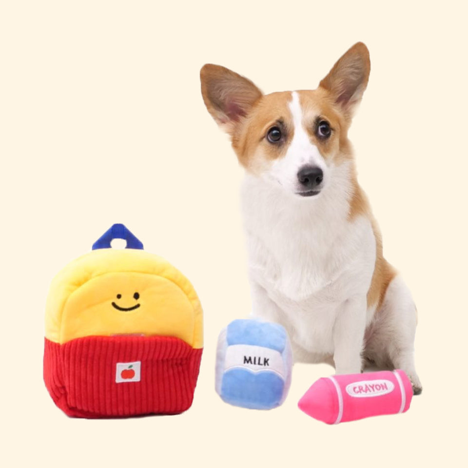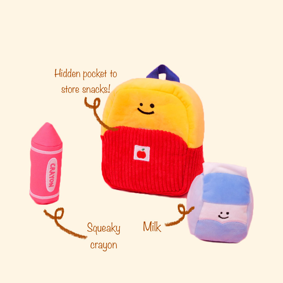 It is time for school! Don't forget your snack and stationaries, we've got the ultimate Back To School Smart Kits for your pups! The kit comes with 3 toys- backpack, squeaky crayon and a small box of milk! You can hide snacks inside the sleeve of the backpack and let your pup sniff for all the goodies. You can also let your dog carry their own backpack by attaching it to their harness.